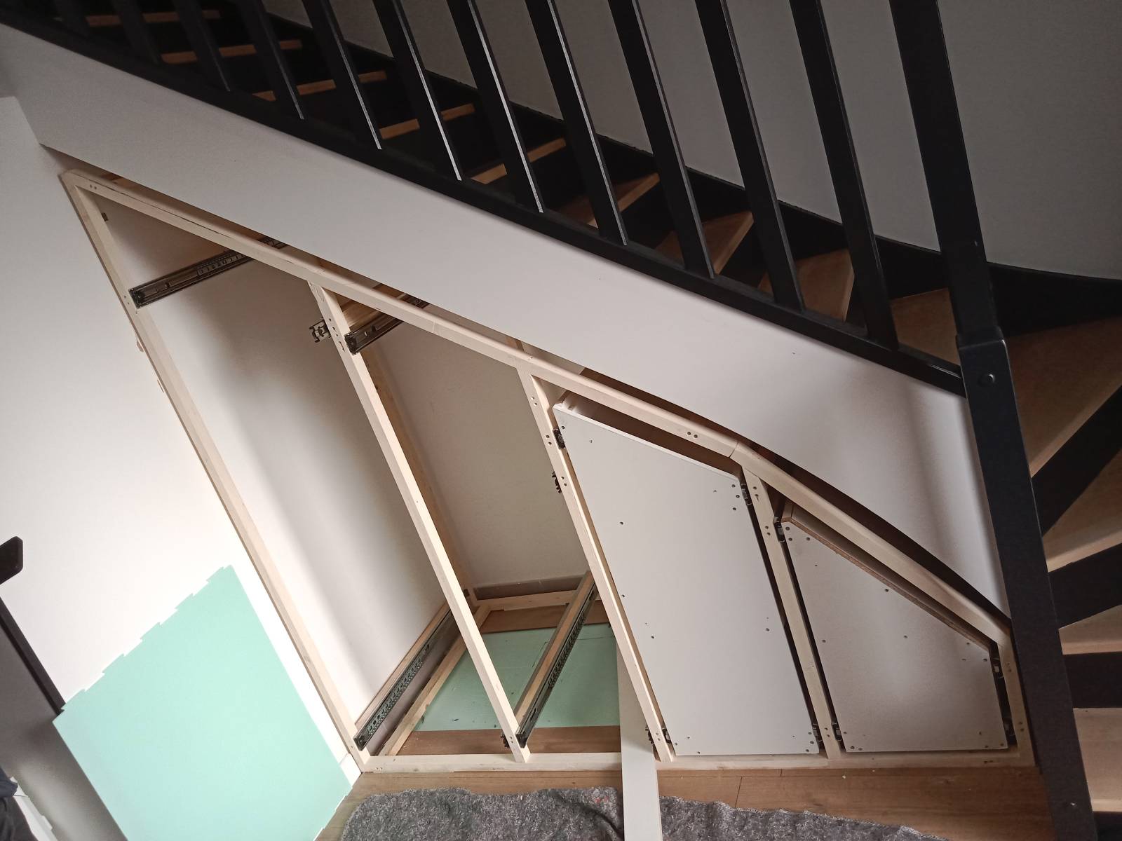 Avec cet aménagement sous escalier à caissons coulissants sur rail, SD Menuiserie prouve une nouvelle fois que chaque recoin peut devenir un atout, lorsqu’il est pensé avec précision et créativité.