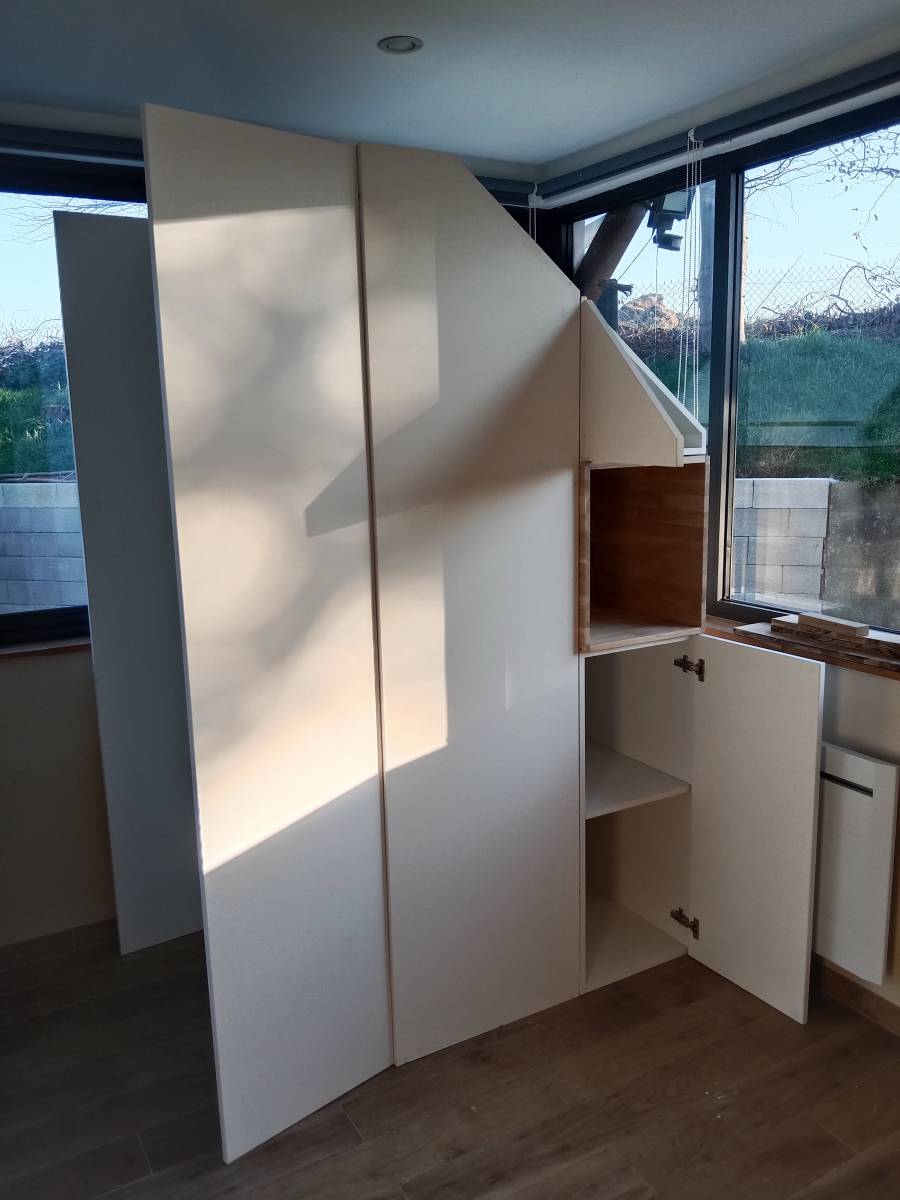 Après une analyse des volumes et des attentes du client, SD Menuiserie a imaginé un meuble à la fois pratique et esthétique, parfaitement adapté à l’agencement de la pièce.