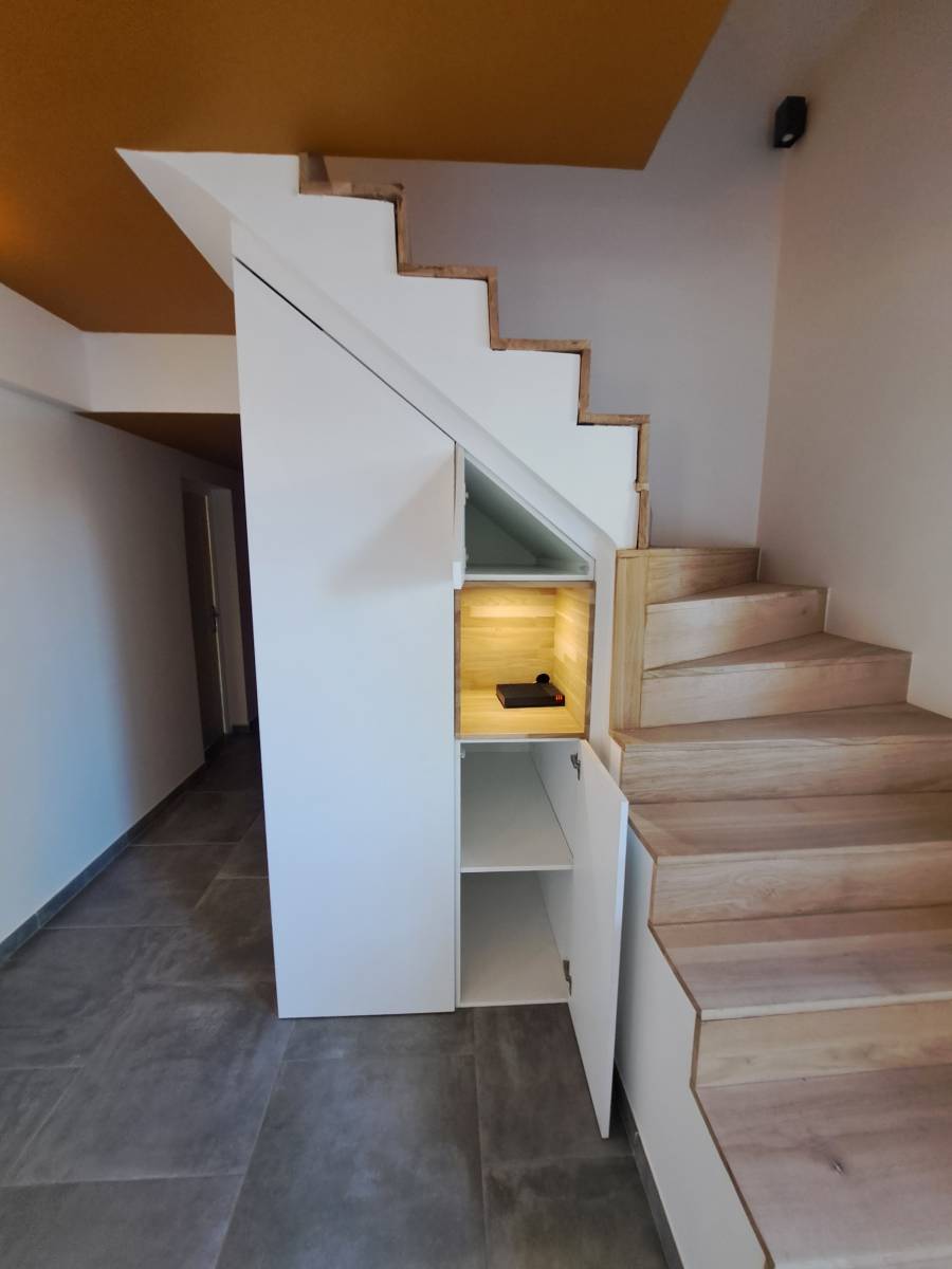 L’intégration du meuble a été réalisée avec une grande précision, exploitant parfaitement les dimensions disponibles sans alourdir l’espace. Chaque détail a été pensé pour optimiser l’usage tout en conservant une circulation fluide dans l’entrée.