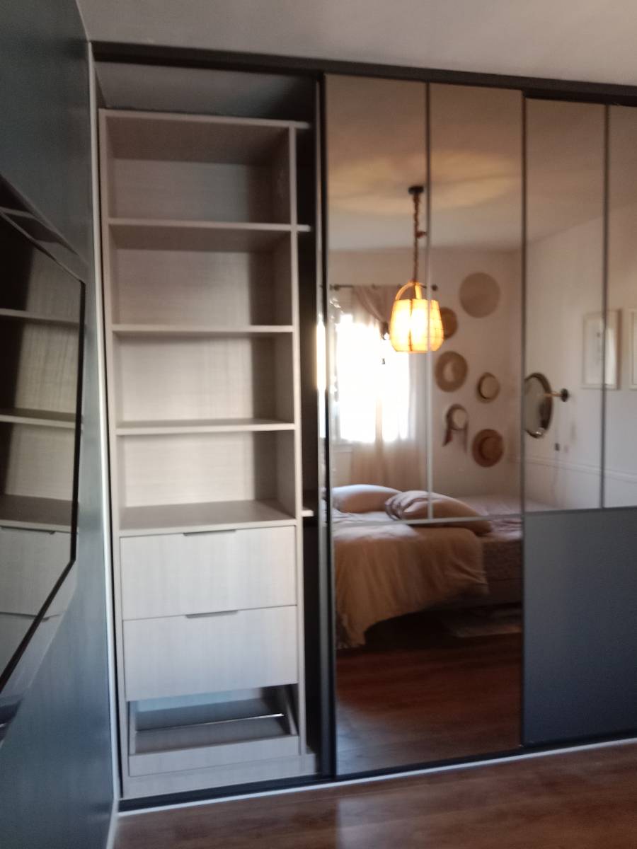 Voici un projet récent que nous avons installé, c'est un dressing sur mesure avec des portes coulissantes au Havre. Nous avons travaillé en collaboration avec notre fournisseur Lapeyre. C'est un ensemble avec tiroirs, étagères et penderie escamotable.