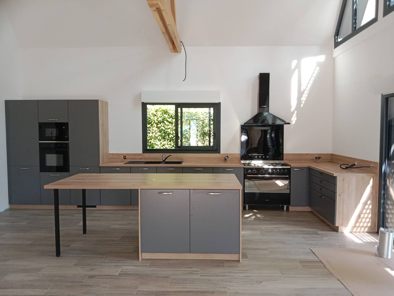 La cuisine installée se distingue par des lignes épurées, des rangements optimisés et une parfaite intégration dans l’espace existant.